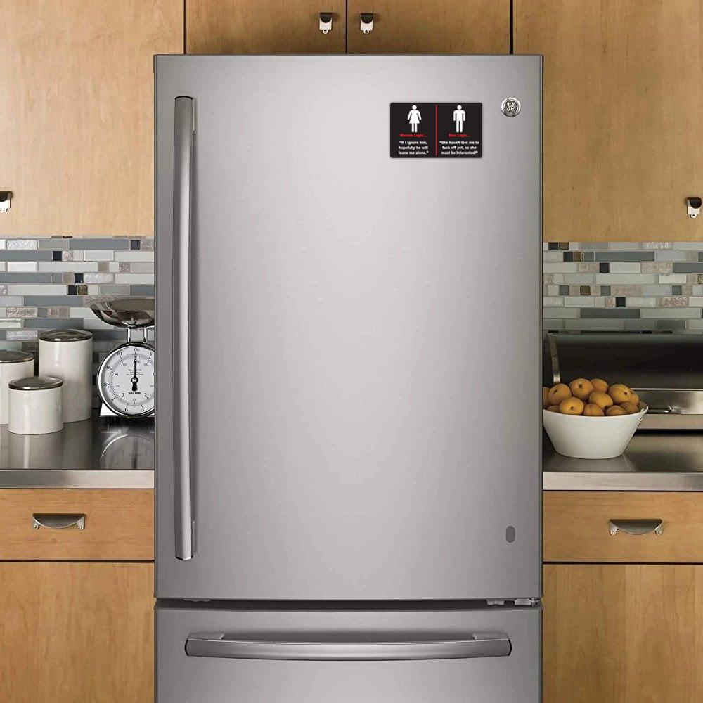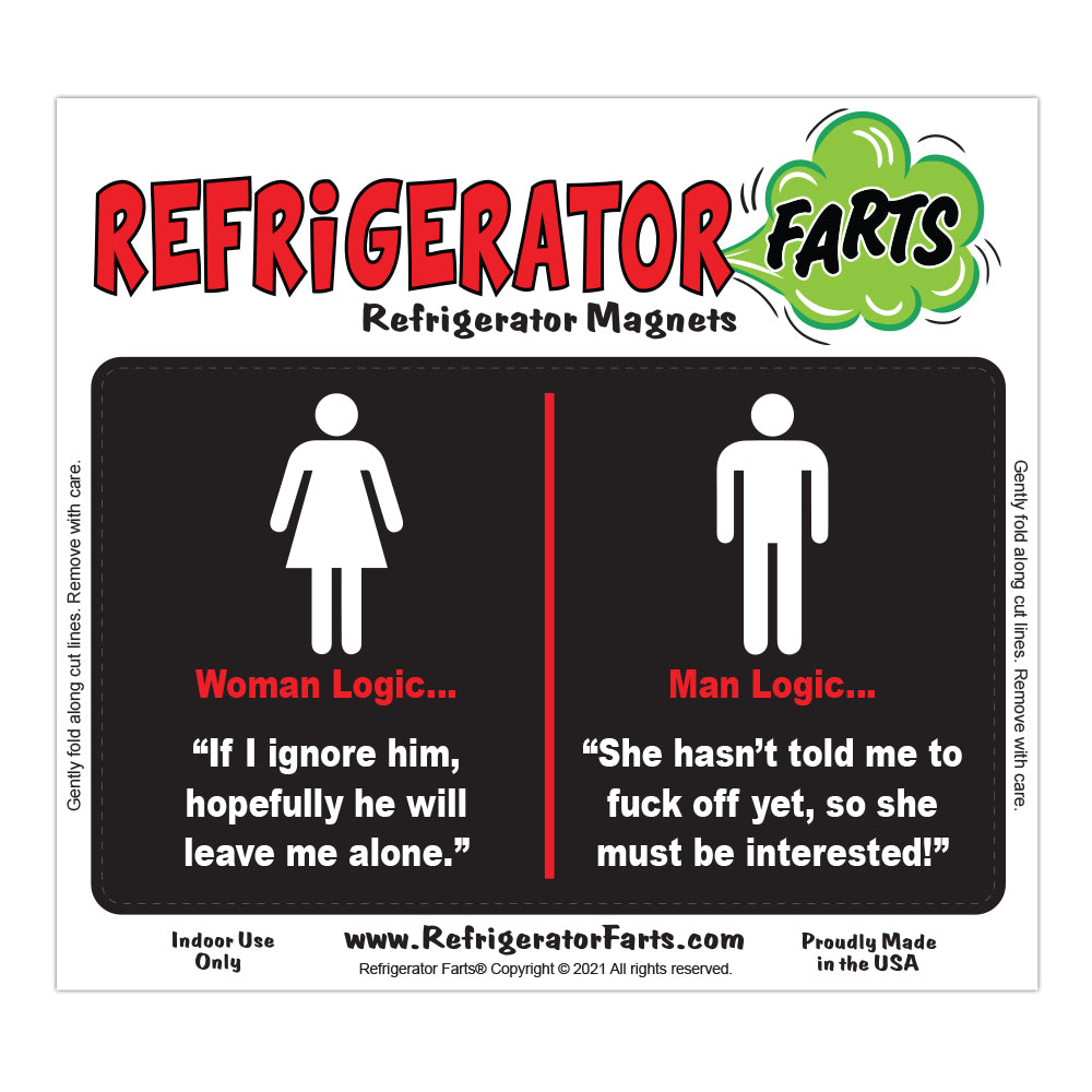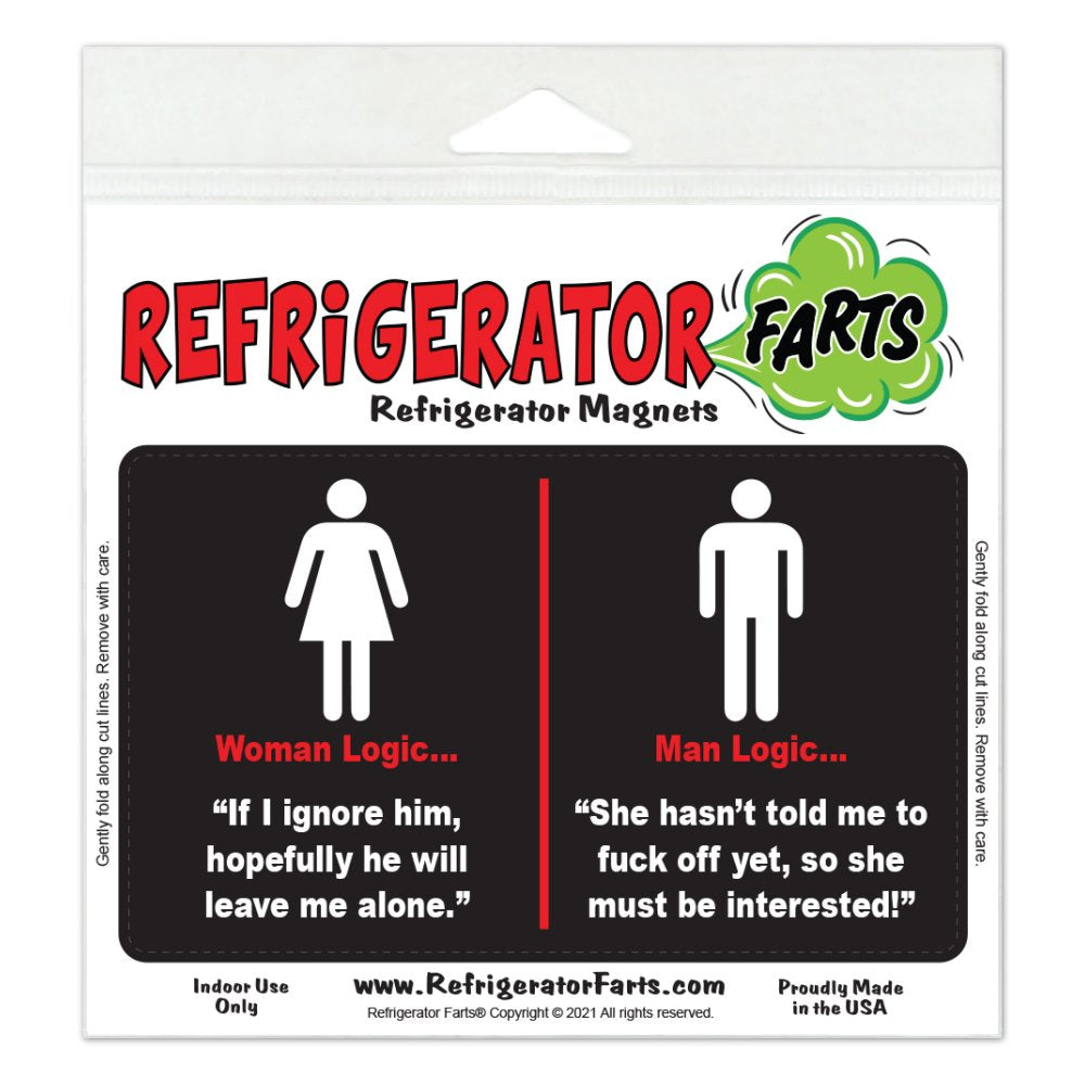 Magnet text: Woman Logic... "If I ignore him, hopefully he will leave me alone." Man Logic... "She hasn't told me to fuck off yet, so she must be interested!"