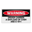 Funny Warning Sticker - Driver Carries A Shitload Of Cash And A 1911